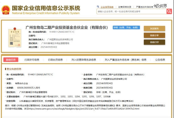 投资界-解码LP获悉,近日财米网,广州生物岛二期产业投资基金合伙企业(有限合伙)正式成立,总出资额为6.06亿元人民币。该基金由广州高新区投资集团有限公司和广州国聚创业投资有限公司(简称“国聚创投”)共同出资设立,主要经营范围涵盖私募基金、股权投资、投资管理及资产管理等领域。执行事务合伙人为国聚创投。
