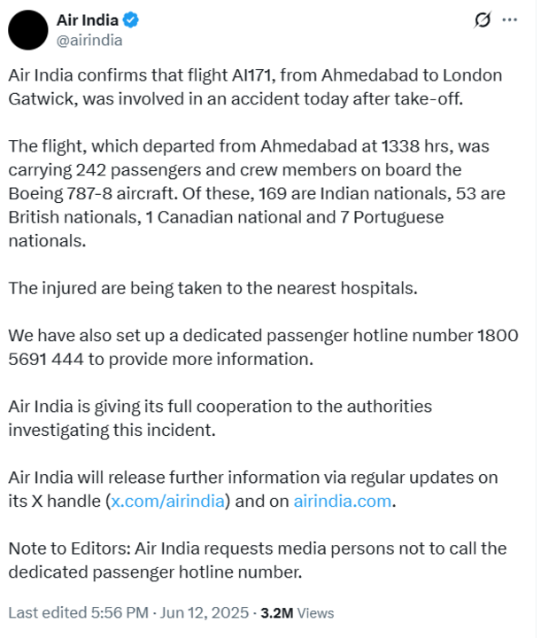 波音公司12日在社交媒体发文说:“我们正就171航班事宜与印度航空保持联系,并随时准备提供支持。我们的心与乘客、机组人员、急救人员以及所有受影响人员同在。”